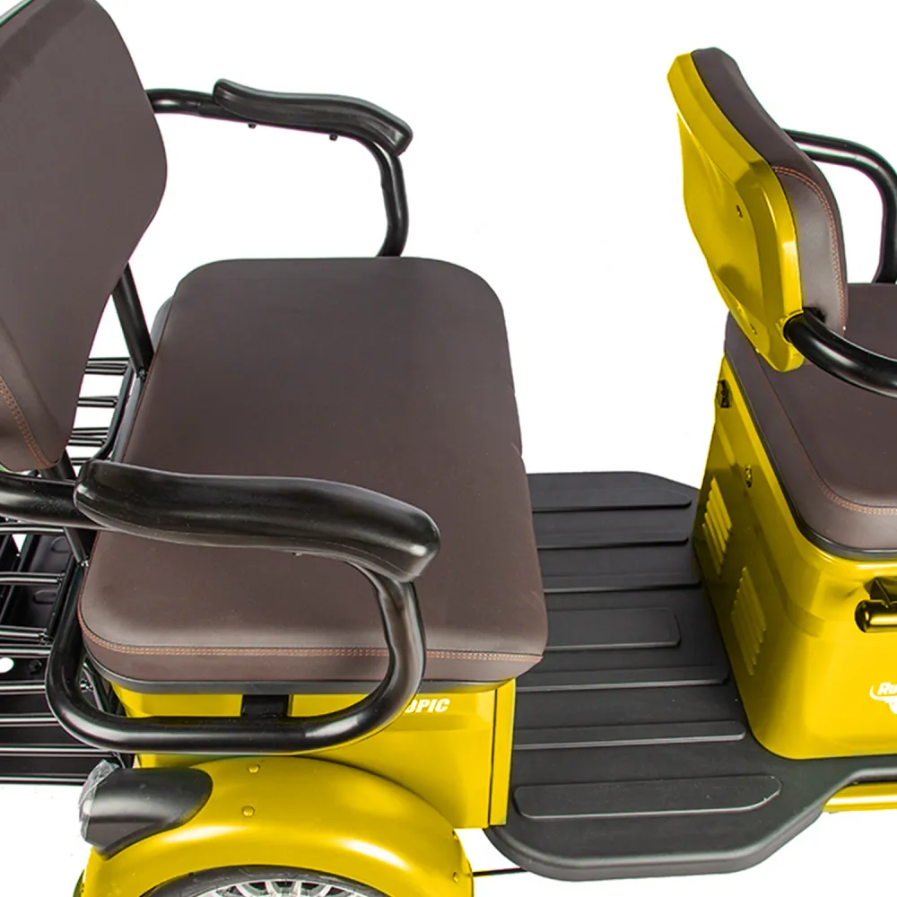 Электротрицикл Rutrike Топик желтый – техника представлена ярким дизайном. Востребована активными целеустремленными личностями, предпочитающими отдых на свежем воздухе. Также модель популярна в частном бизнесе и туристическом сервесе. Стальная конструкция рамы выдерживает максимальную грузоподъемность, не деформируется и не теряет первоначальных характеристик. Комфорт обеспечен широкими сиденьями из эко-кожи. Водительское сиденье анатомическое со спинкой и подлокотниками, исключает усталость и проблемы с позвоночником. В заднем сиденье имеется отсек для груза, может использоваться в качестве багажника. Мягкая платформа исключает отек ног. Мощность электромотора составляет 800 Вт. Батарея в комплектации отсутствует. Производитель предупреждает, что для данной модели трицикла необходимая емкость аккумуляторной батареи составляет 48 В и 60 В. Колесная часть – накатистая, 10-дюймовая, отлично сцепляется с разными видами поверхности. Наличие яркого светодиодного освещения, фирменных тормозов и зеркал заднего вида увеличивает степень безопасности езды, допускает эксплуатацию техники в вечернее время и непогоду. Для приобретения модели оперативно, по приемлемой цене предлагаем прямо сейчас сделать телефонный звонок нашему менеджеру или связаться с ним в чате.