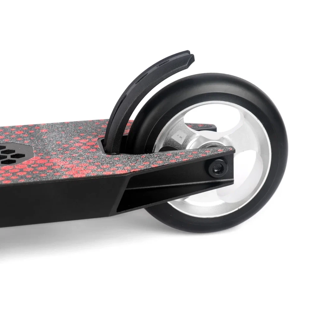 Колеса диаметром 110 мм обеспечивают отличную устойчивость и плавность передвижения на различных поверхностях. Комбинация черного и красного цветов создает стильный и запоминающийся внешний вид самоката, который подчеркивает его спортивный характер.