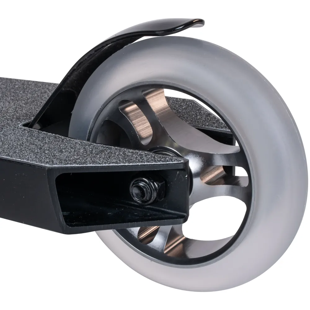 Колесная часть размером 110 мм изготовлена из мало стираемого полиуретана. Наличие алюминиевой фрезерованной вилки и фирменного заднего тормоза райдер может рассчитывать на качественный безопасный отскок.